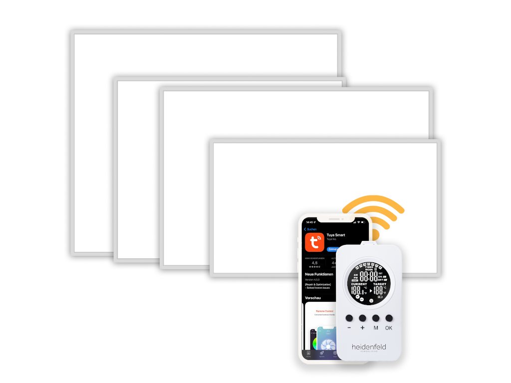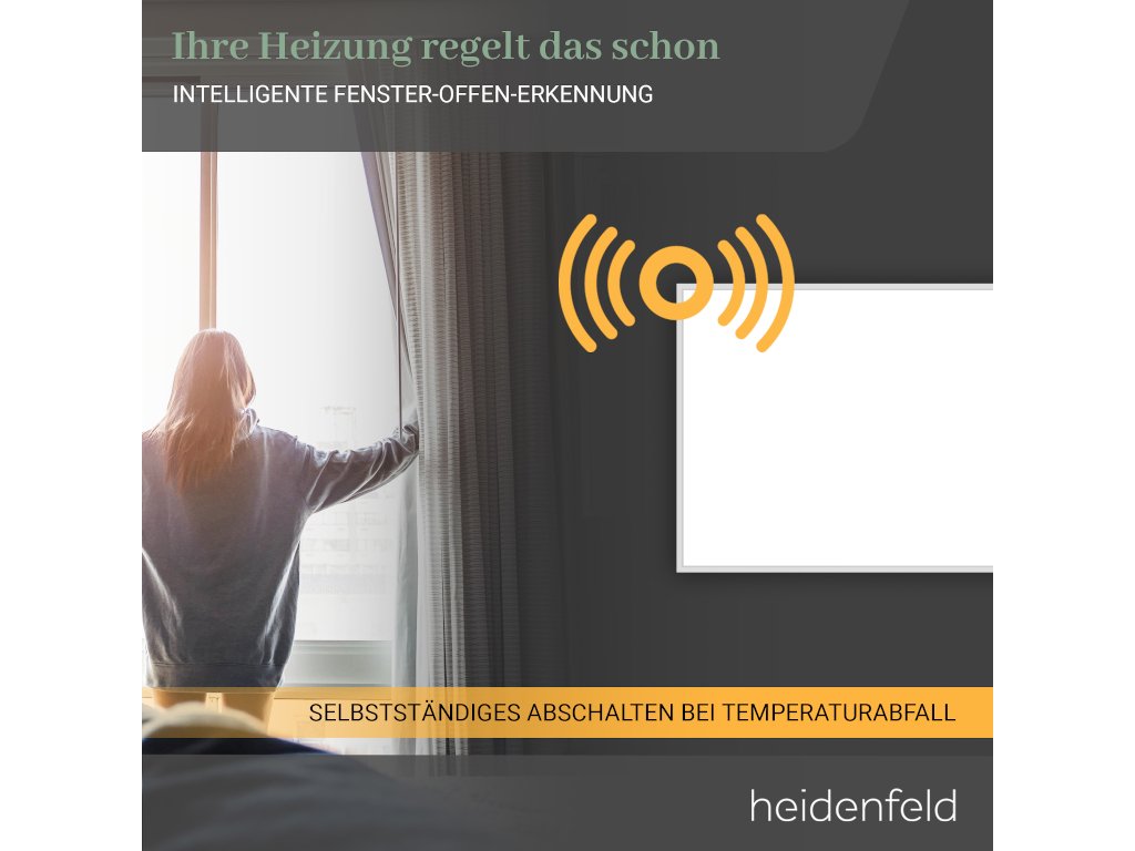 A vizuálisan vonzó mennyezeti és fali fűtőtest többféle változatban kapható. Így minden szobamérethez a megfelelő modellt kapja. A TÜV Süd és a GS pecsétek tanúsítják az infravörös fűtés magas biztonsági színvonalát. Várakozással tekinthet a különleges hőkomfort, több mint 100 000 órás élettartam elé. A nyitott ablak érzékelésének köszönhetően az infravörös fűtőberendezés szükség esetén ki is kapcsolja magát. Ezenkívül kényelmesen vezérelhető mobiltelefonjáról a Tuya Smart alkalmazással. Vagy vezérelheti a termosztáttal ellátott távirányítóval. A Heidenfeld infravörös fűtőberendezés műszakilag briliáns, modern dizájnnal rendelkezik, és meggyőző a praktikus működésével.