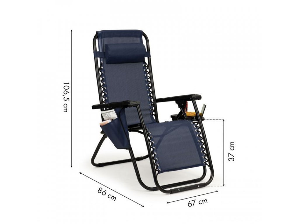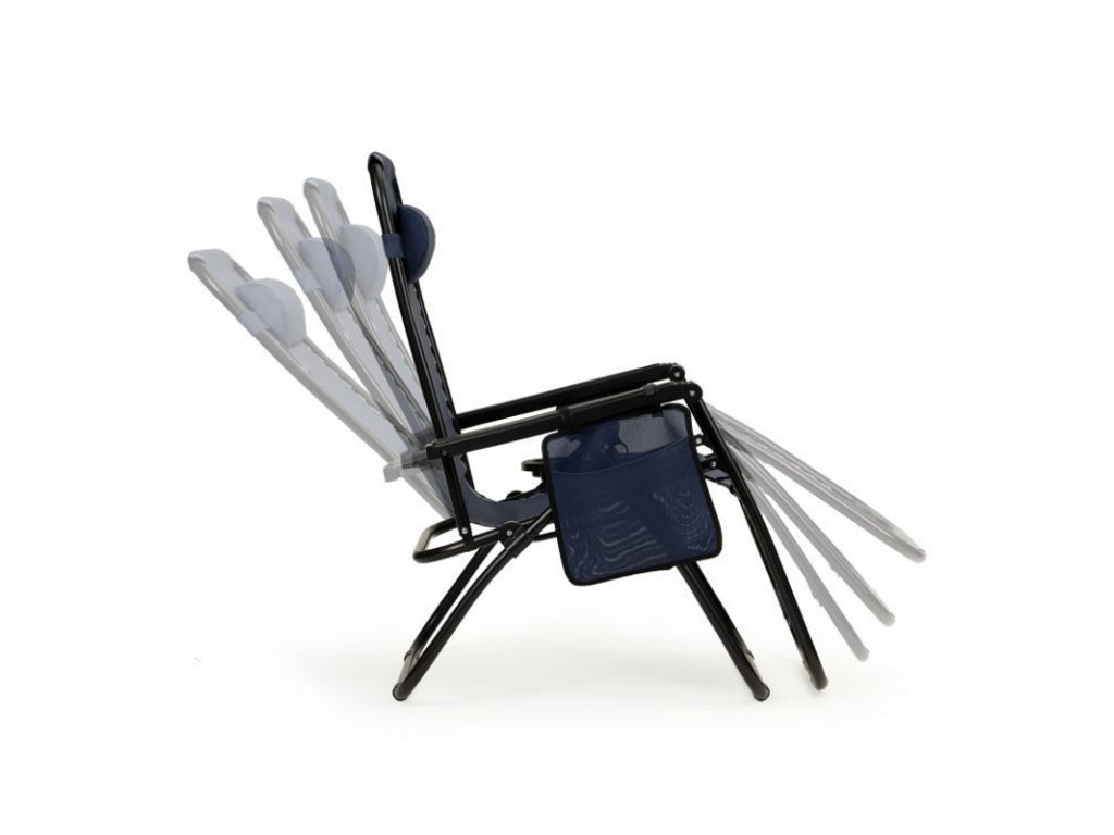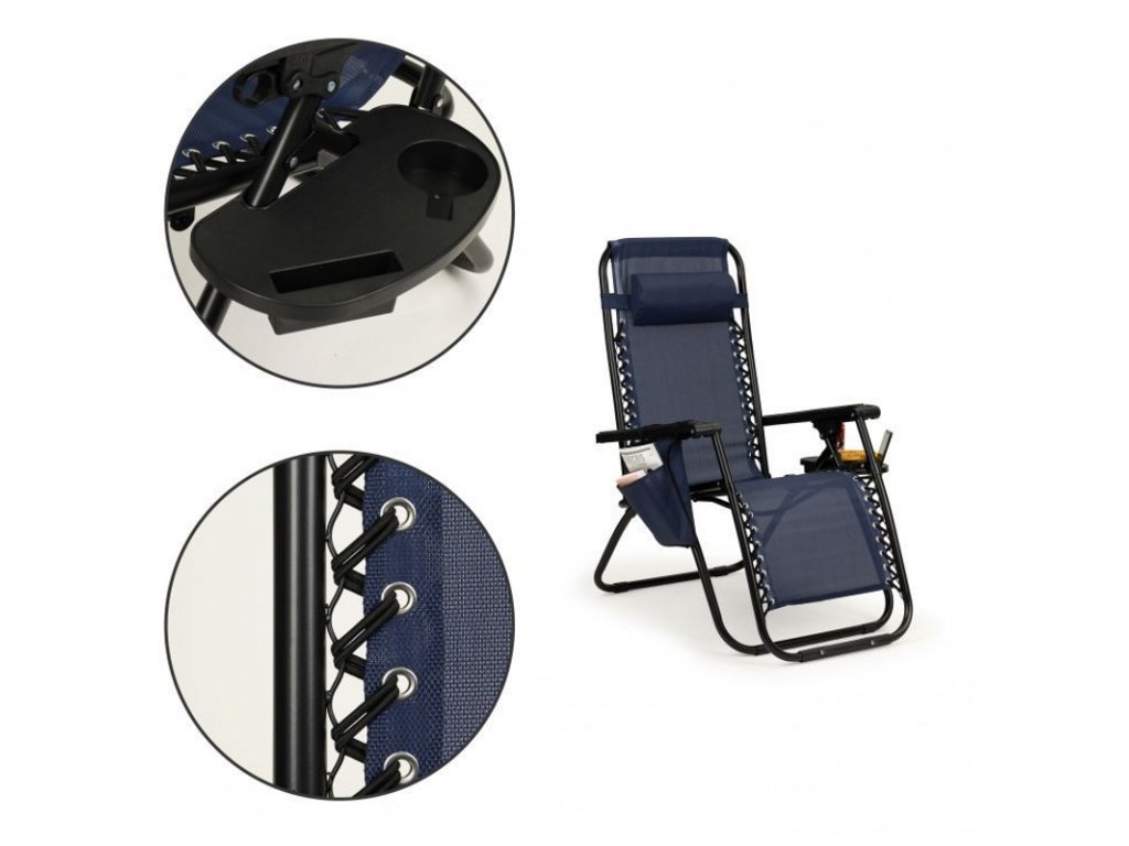 A napozóágy felépítésének köszönhetően, lehetővé teszi az ágy fekvő helyzetének beállítását 3 fokozatban. Vízáteresztő anyagból készült, aminek köszönhetően vízálló, így kint lehet hagyni. A nagyobb kényelem érdekében a napozóágy fejtámlával van ellátva. Ezenkívül a napozóágy oldalsó része táskával, telefon- és pohártartóval van felszerelve. A nyugágy lábai csúszásgátló alátétekkel van ellátva, így nem kell aggódnia a stabilitás és a padló karcolódás miatt. Könnyen összecsukható, ennek köszönhetően tárolható és szállítható.