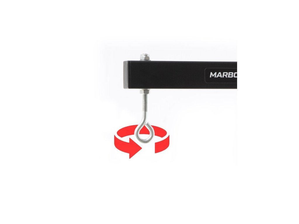 A boxzsák falitartó a MARBO Sport MA-B002 2.0 acélprofilból készül, amelynek mérete 50 x 50 x 2 milliméter, és ennek köszönhetően teherbírása akár 150 kg is lehet. A falra történő rögzítést 8 rögzítőfurattal hajtjuk végre, az aljzattól függően, megfelelően kiválasztott rögzítőanyaggal. Az acélszemet, amelyen maga a boxzsák lóg, két anya biztosítja a felborulás ellen, amelyek egymáshoz vannak szorítva , amely megakadályozza a lazulást. A függő szem távolsága a faltól 100 cm. A boxzsák körül elegendő hely van a mozgásra, és az edzés maximálisan biztonságos. A rögzítő anyagot nem tartalmazza.