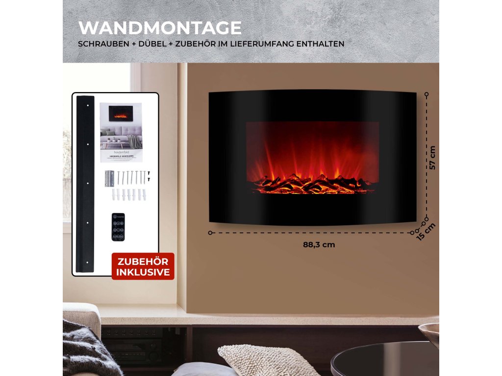 A Heidenfeld HF-WK100 elektromos kandallóhoz minden csavart, tiplit és rögzítőelemet megkap, hogy a készüléket gyorsan és egyszerűen a falhoz rögzíthesse. Csak egy kis biztonságos távolságra van szükség más tárgyaktól, például bútoroktól és függönyöktől. Ezért a fali kandallót rugalmasan elhelyezheti a helyiségben, és optimálisan integrálhatja a lakótér kialakításába.