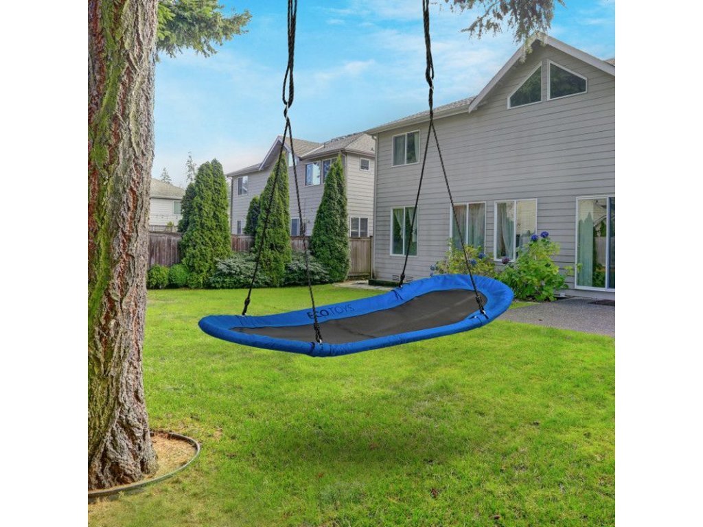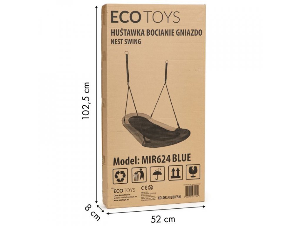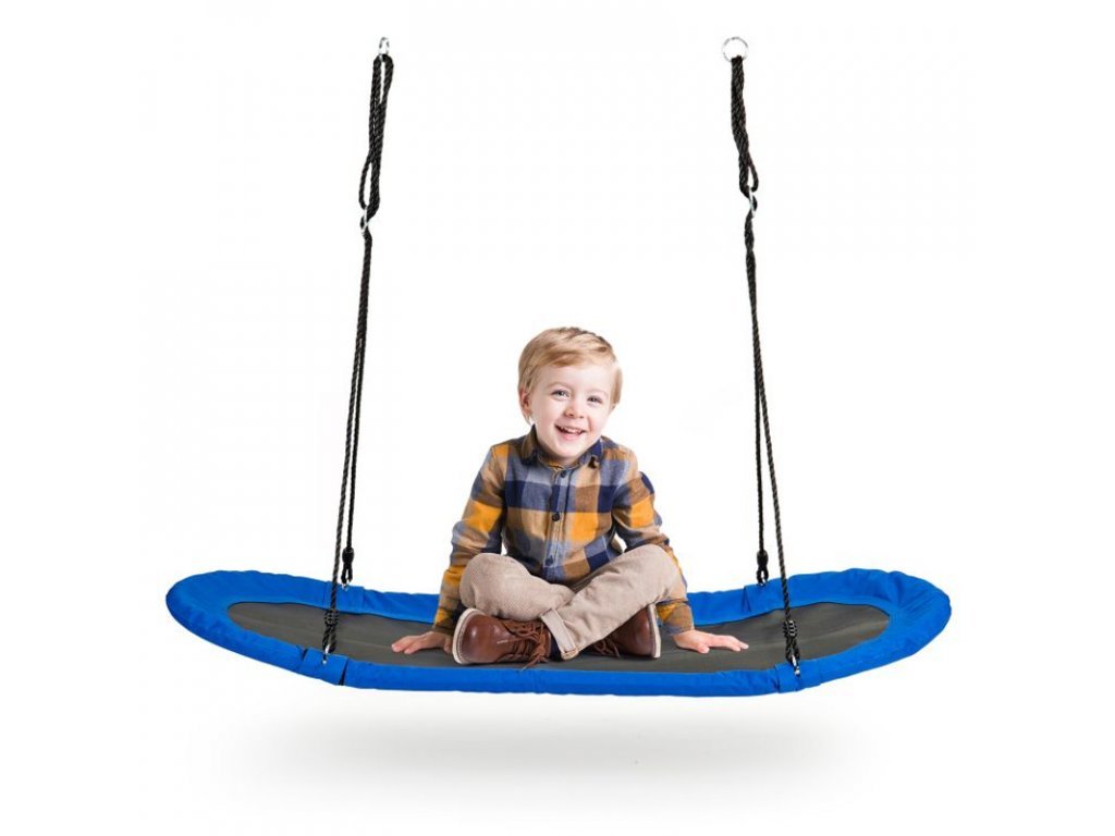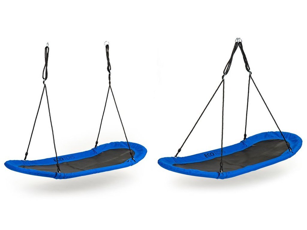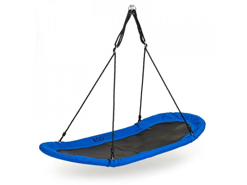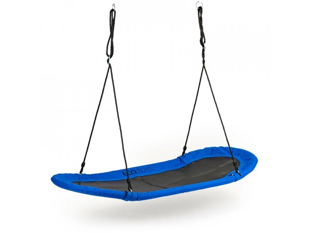 A hinta fémkerete puha habbal van bevonva, amely biztosítja a biztonságot a játék során. A nagy, 100 cm átmérőjű ülés erős "hálós" anyagból készül, ami órányi szórakozást garantál. A hinta 10 mm vastag köteleket tartalmaz, amelyek egy vagy két ponton rögzíthetők. A kötelek hossza állítható, így könnyedén beállíthatja a magasságát. A maximális terhelés 100 kg. A hinta elkészítéséhez használt anyag biztosítja az időjárási viszonyokkal szembeni ellenállását.