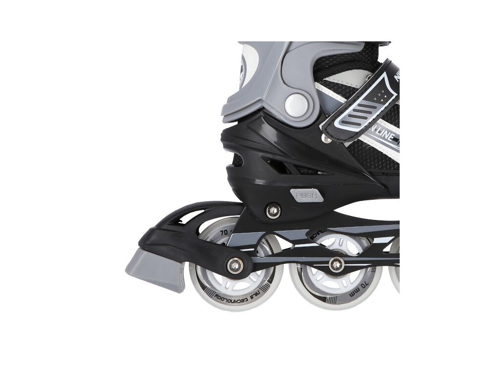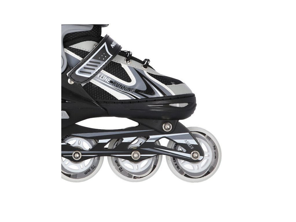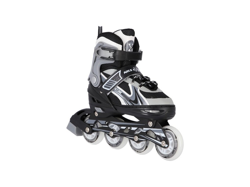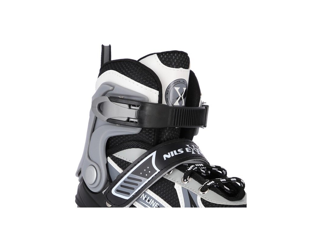 A Nils Extreme NH 18188 A stílusos korcsolya az aszfalton és a jégen egyaránt. Kiváló minőségük hosszú élettartamot és nagy ellenállást nyújt a sérülésekkel szemben. Az NH 18188 A modellt négyszintű cipőméret-beállítással is ellátták, amely a felhasználó igényeinek megfelelően állítható be. Ez időt és pénzt takaríthat meg. Egy ilyen megoldás meghosszabbítja élettartamukat, és lehetővé teszi, hogy egynél több ember használhassa őket, vagy használhatók a gyermek lábával növekvő korcsolyának. A korcsolya rögzítését műanyag csat, tépőzár és klasszikus fűzés három kombinációja oldja meg. A kés kemény, rozsdamentes acélból készül. A keréksín 82A és ABEC7 csapágy keménységű kerekekkel van felszerelve.