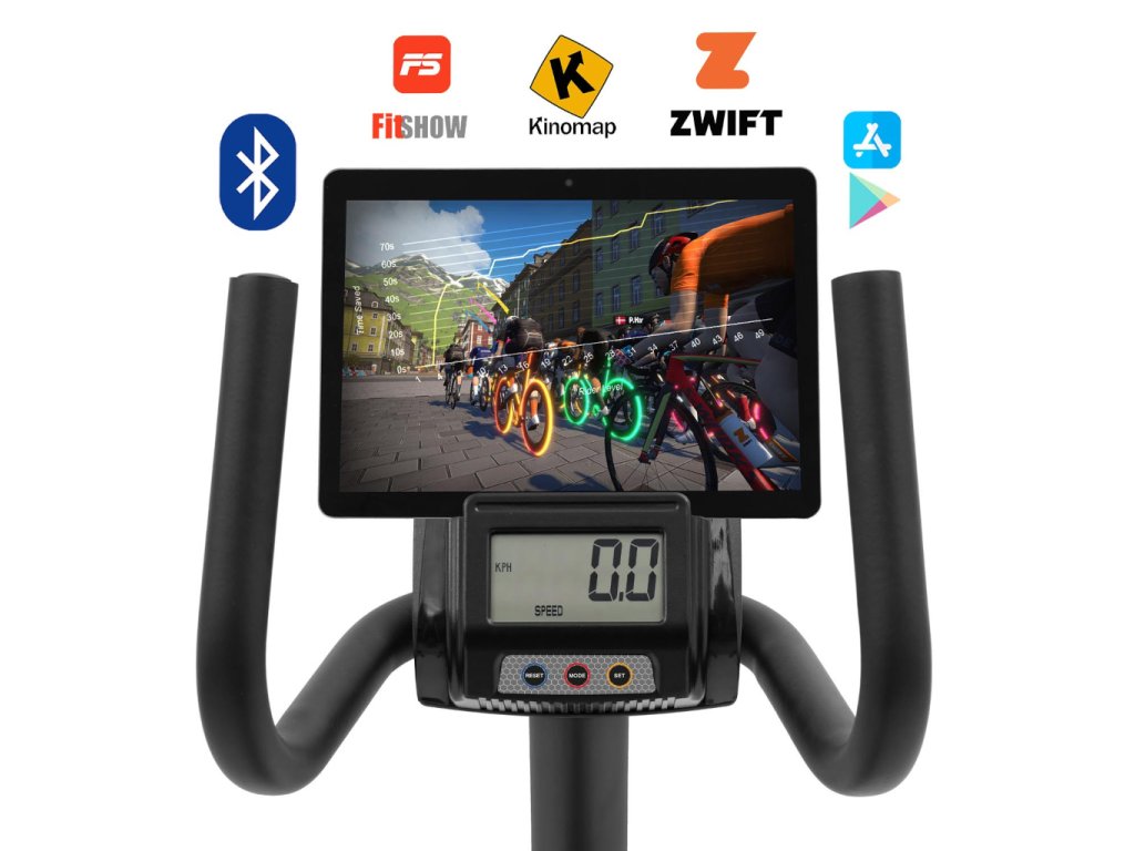 Az áttekinthető, integrált számítógép minden fontos adatot megjelenít – idő, sebesség, távolság, elégetett kalóriák és pulzus, amelyet a markolatokban elhelyezett érzékelők mérnek. A Bluetooth kapcsolat lehetővé teszi az összekapcsolást olyan alkalmazásokkal, mint a FitShow, a Kinomap vagy a Zwift, így valósághű útvonalakat és személyre szabott edzéseket élvezhetsz közvetlenül a tablet kijelzőjén.