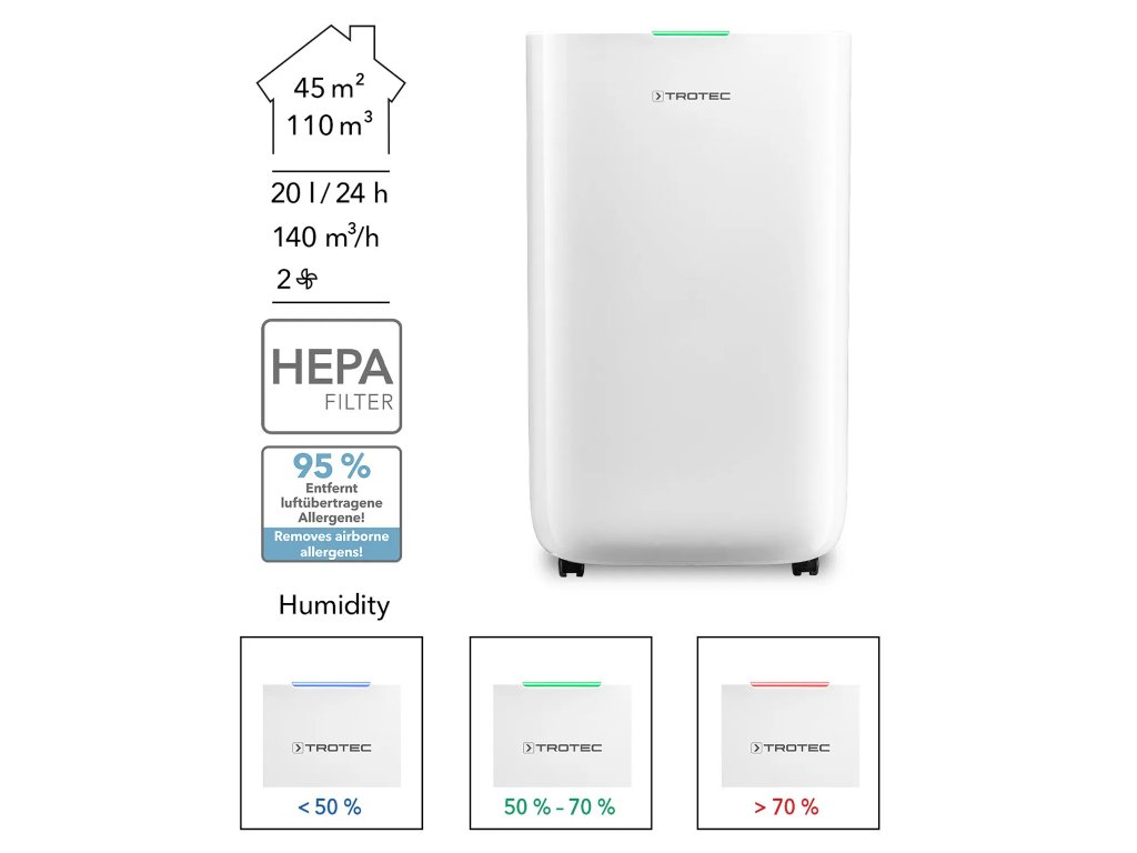 Éljen egészségesebben, lélegezzen szabadon, és élvezze a kényelmes élet- vagy munkakörnyezetet egész évben – az optikailag és műszakilag kiváló TTK 70 HEPA párátlanító ezt akár 45 m²-es vagy 110 m³-es helyiségekben is lehetővé teszi.