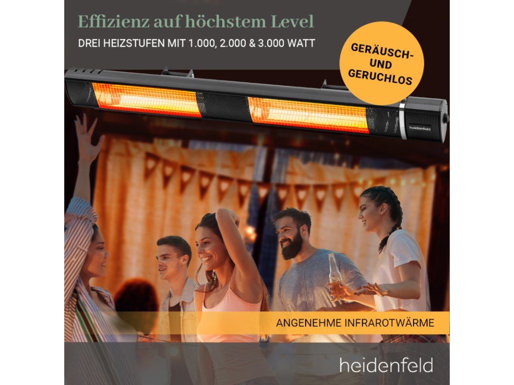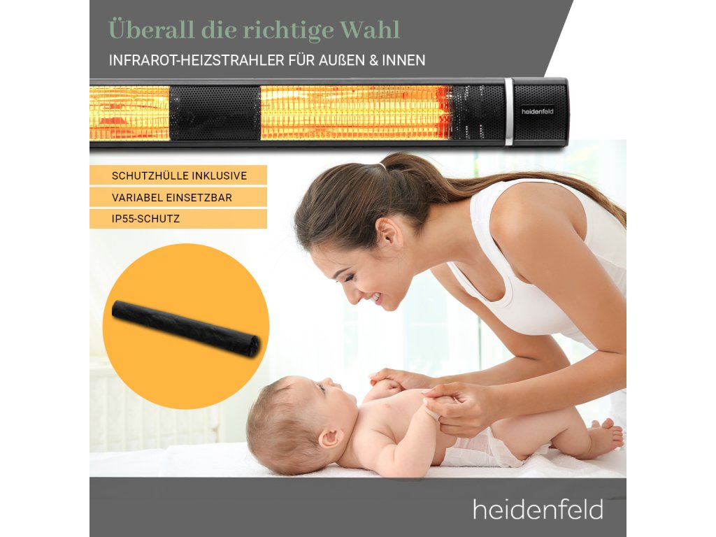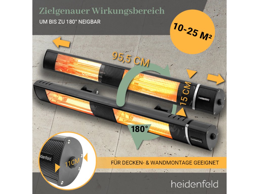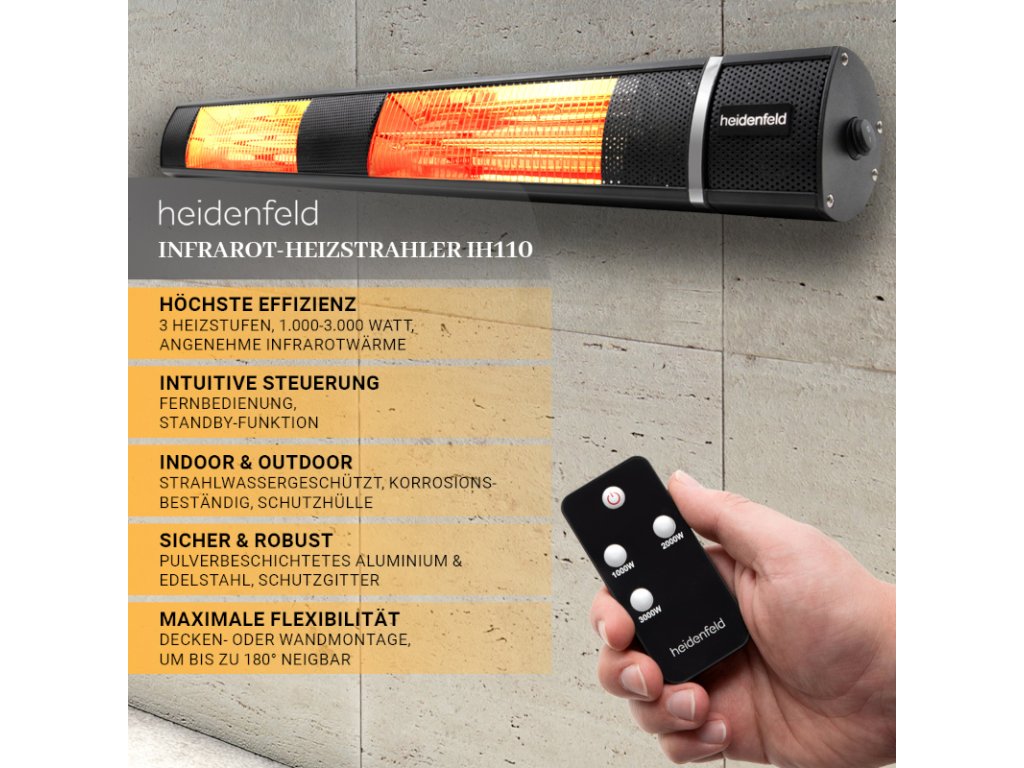 A Heidenfeld IH110 2.0 infravörös fűtőtesttel élvezheti a precíz hőtermelés lenyűgöző előnyeit. Akár 180 fokban is dönthető! Így az infravörös sugárzó célzottan beállítható.