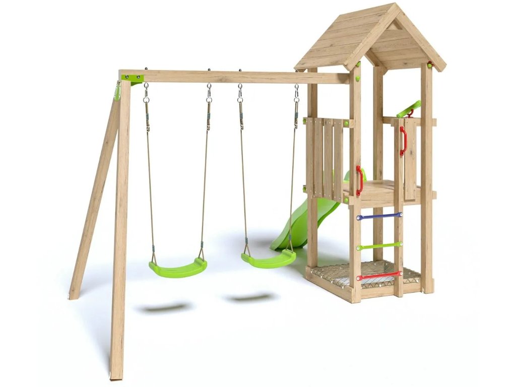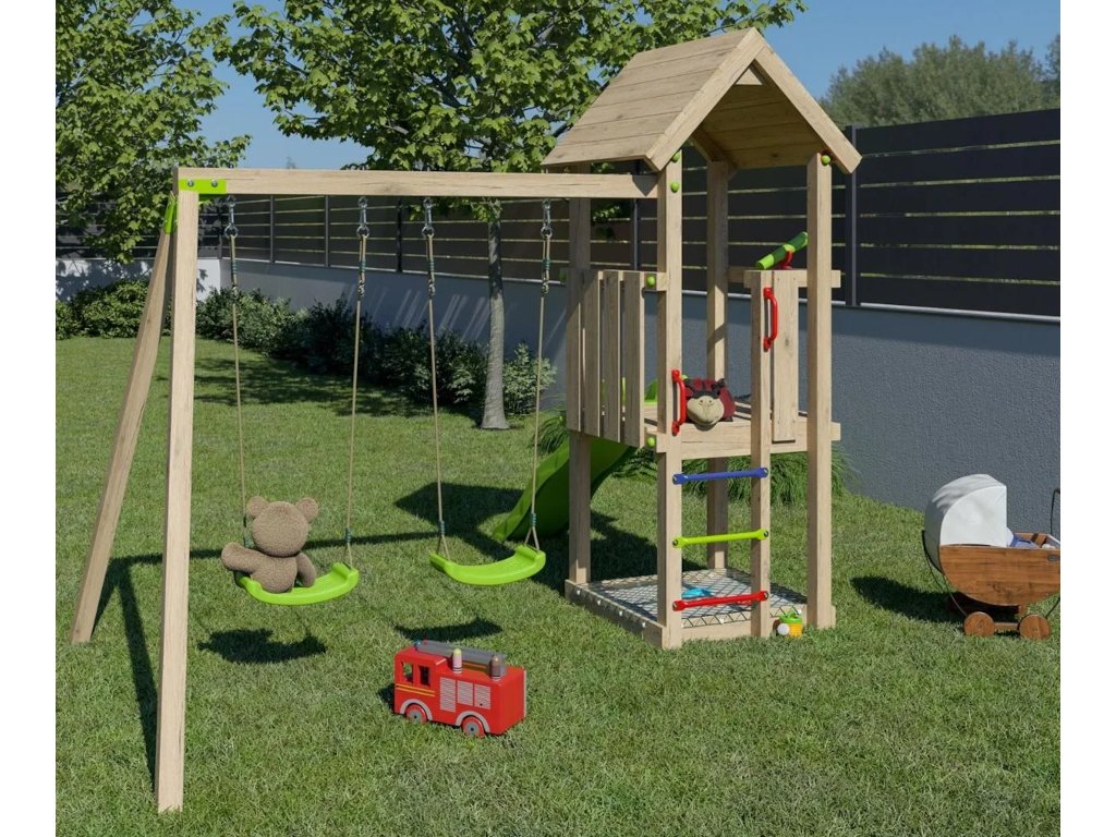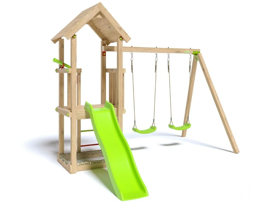 A játszótér építése erdei fenyőből készült. Sima, egyenetlenségek nélküli felülete ideális a kisgyermekek kezéhez.