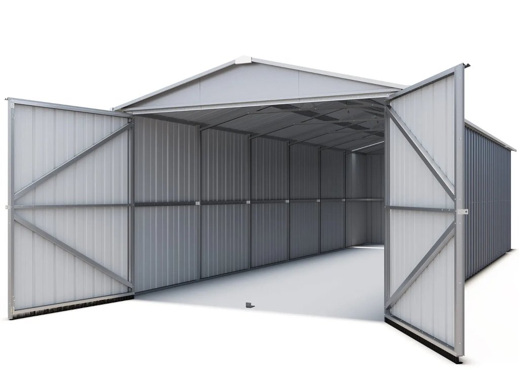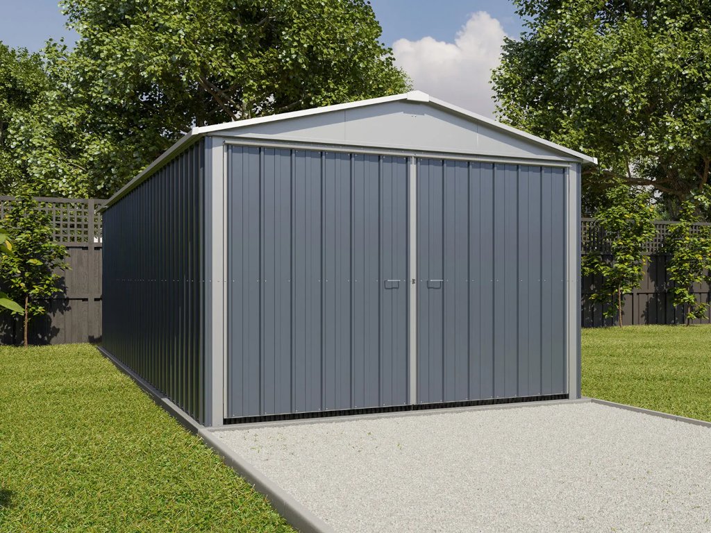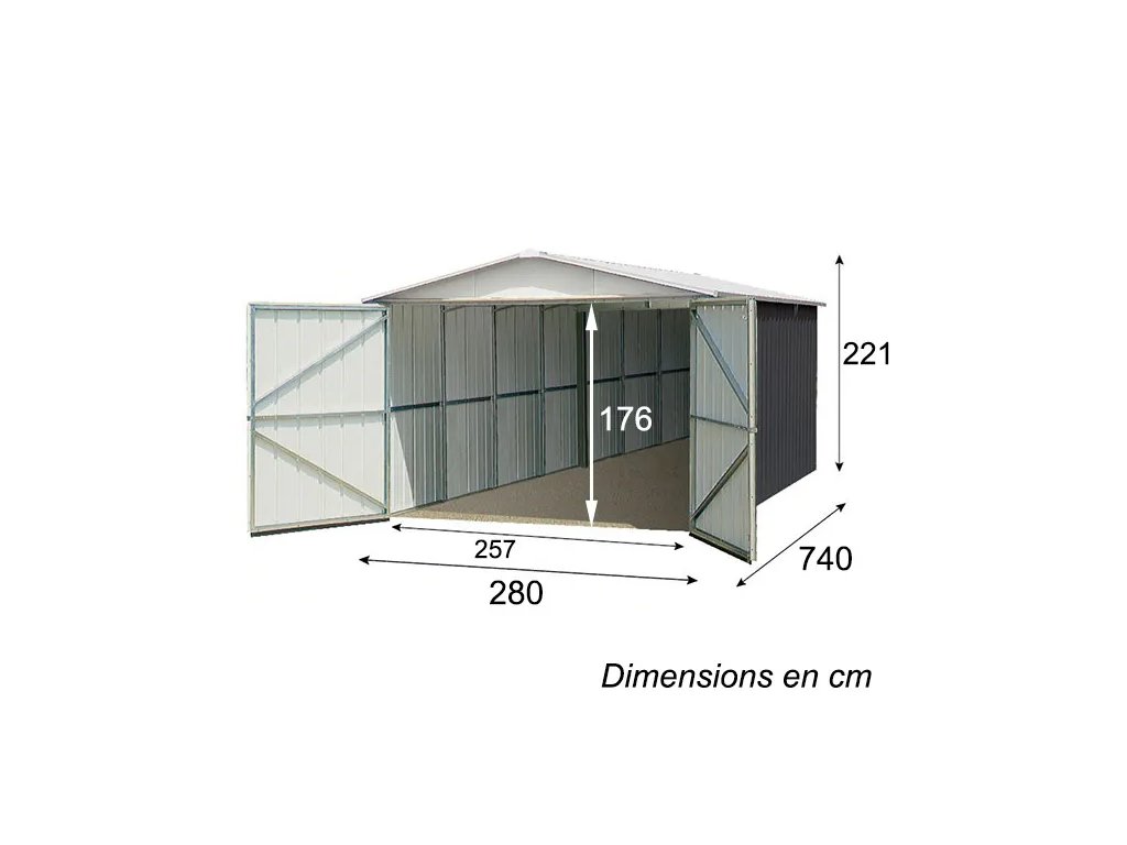 Járművek tárolására alkalmas garázs. A horganyzott szerkezetnek köszönhetően nincs szükség karbantartásra.