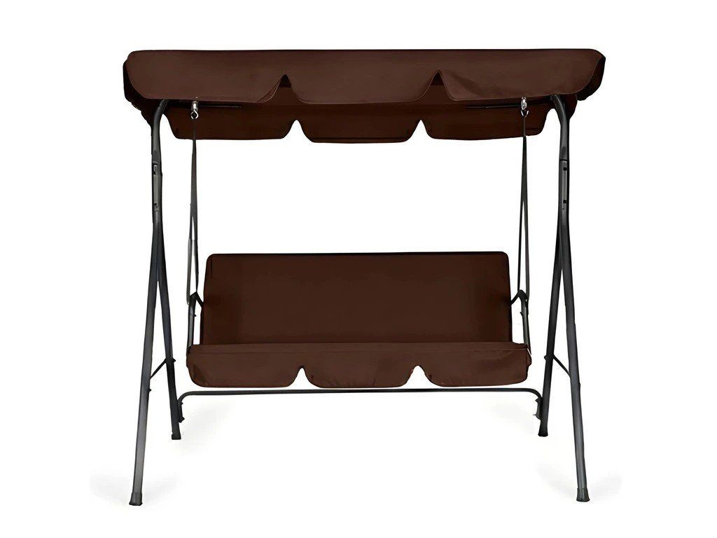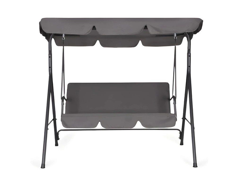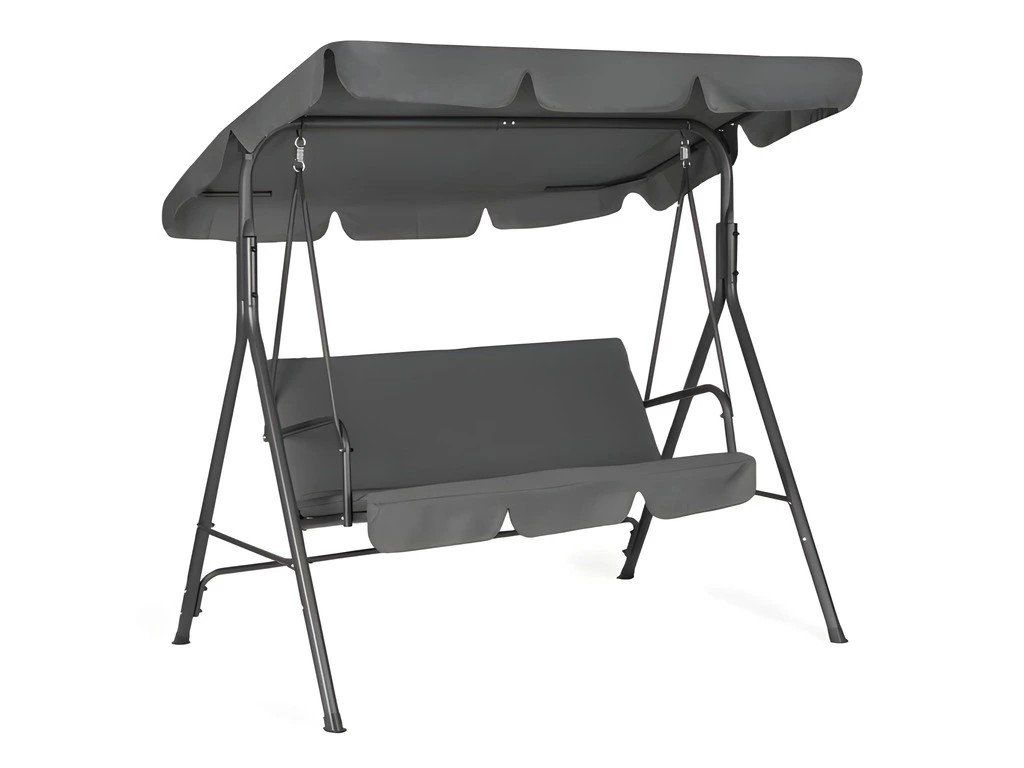 Ez a kerti hinta kertekbe, teraszokra és kertekbe készült, és kényelmes helyet biztosít három ember számára a pihenéshez. Tartós acélváza stabilitást és ellenállást biztosít a mindennapi használattal és az időjárási viszonyokkal szemben. Az ülés és a háttámla 600D PVC Oxford szövetből készült, amely kopásálló, könnyen tisztítható és gyorsan szárad. A rugók további kényelmet biztosítanak és biztosítják a sima lengést. A hinta állítható, 140 g/m²-es poliészter tetővel van felszerelve, dekoratív fodros díszítéssel, amely véd a nap és a könnyű eső ellen. A csúszásgátló betétek javítják a stabilitást és védik a padlót. A maximális teherbírás 260 kg.