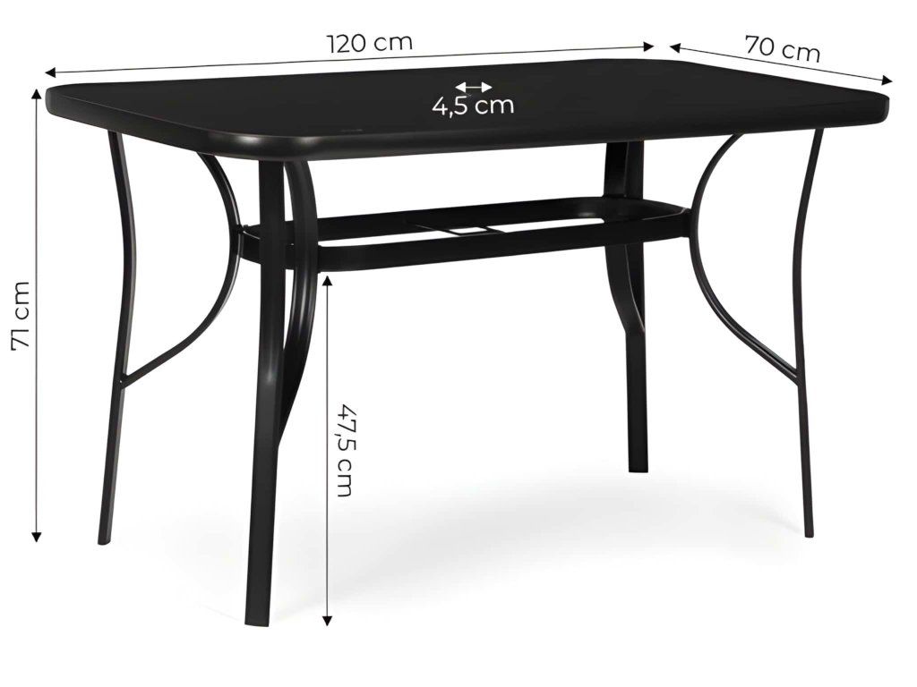 Ez a MultiGarden kerti asztal 160x90 cm-es téglalap alakú asztallappal rendelkezik, amely kényelmes és funkcionális helyet biztosít italok és kiegészítők tárolására. Az edzett üveg asztallap ellenáll a mechanikai sérüléseknek és az időjárás viszontagságainak. A sima felület könnyen tisztítható, míg a fekete keret megerősíti az éleket és növeli az egész szerkezet tartósságát. Az asztallap 4 cm vastag. A stabilitást porszórt acélprofilokból készült alap biztosítja, amelyek hatékonyan védve vannak a korrózió és a nedvesség ellen. A szerkezetet egy összekötő is megerősíti, a csúszásmentes lábak pedig védik a padlót a karcolásoktól. Az asztalra az asztallapon található speciális lyukaknak és a lábakban lévő összekötőknek köszönhetően napernyő is elhelyezhető (lyukátmérő: 4,5 cm). Amikor a napernyőre nincs szükség, a lyuk szépen letakarható a mellékelt takaróval. Az asztal maximális teherbírása 60 kg.