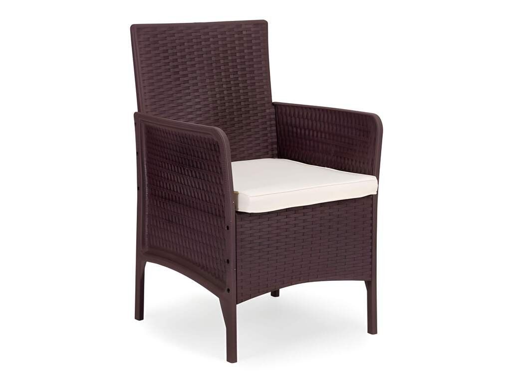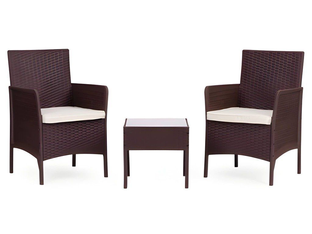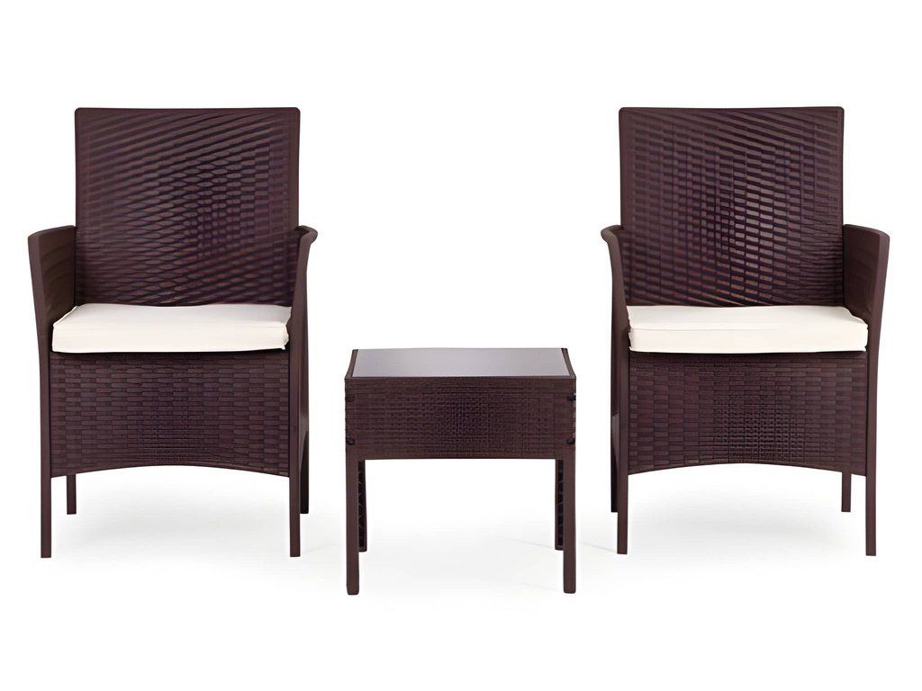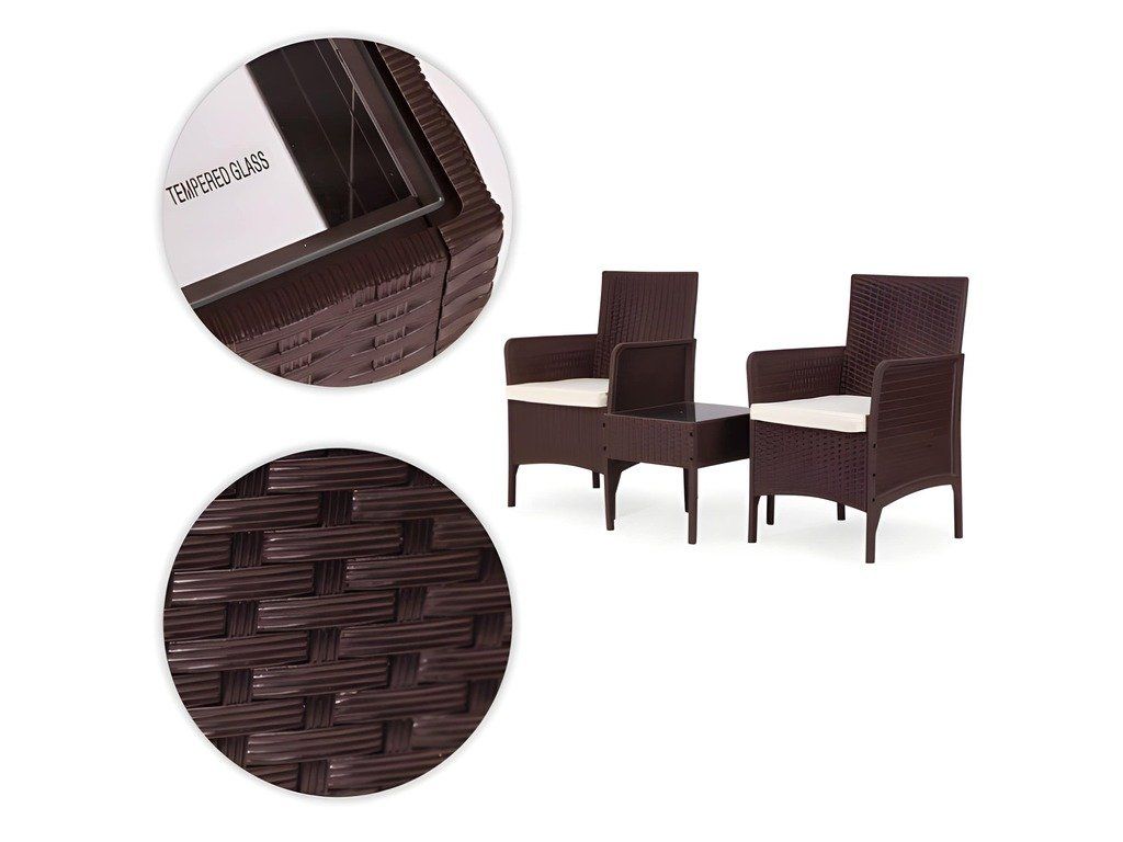 Ez a stílusos kerti bútor szett két fotelből és egy asztalból áll. A robusztus műanyag konstrukció, természetes rattant utánzó felülettel, időjárásállóságot, hosszú élettartamot és könnyű tisztítást biztosít. Az asztallap 5 mm vastag edzett üvegből készült, ami nagyfokú sérülésállóságot biztosít. A szett puha, vízálló poliészterből készült párnákat tartalmaz, amelyek súlya 160 g/m² (vastagság 4 cm). A szék maximális teherbírása 150 kg.