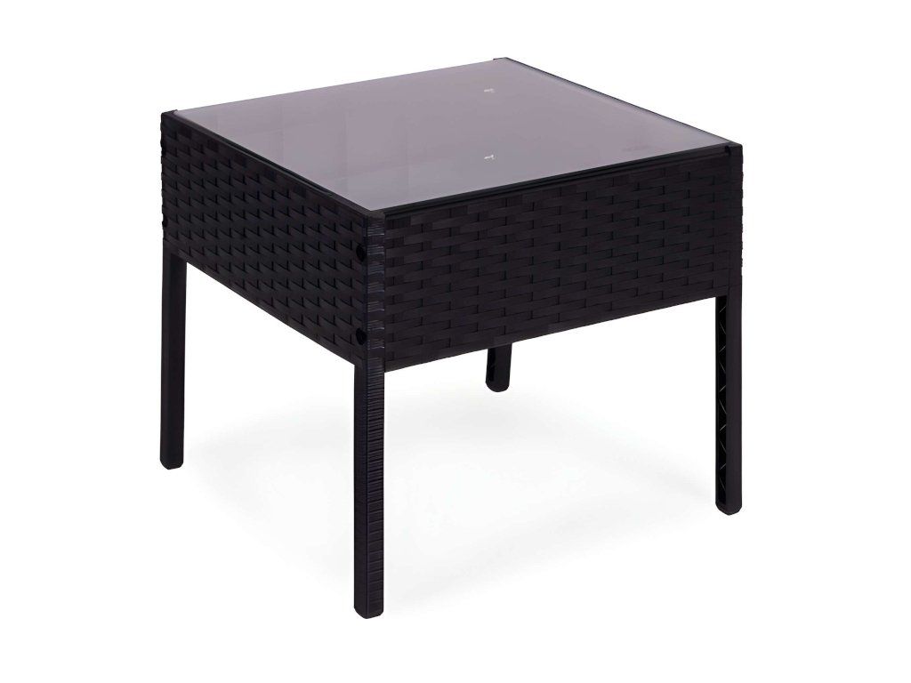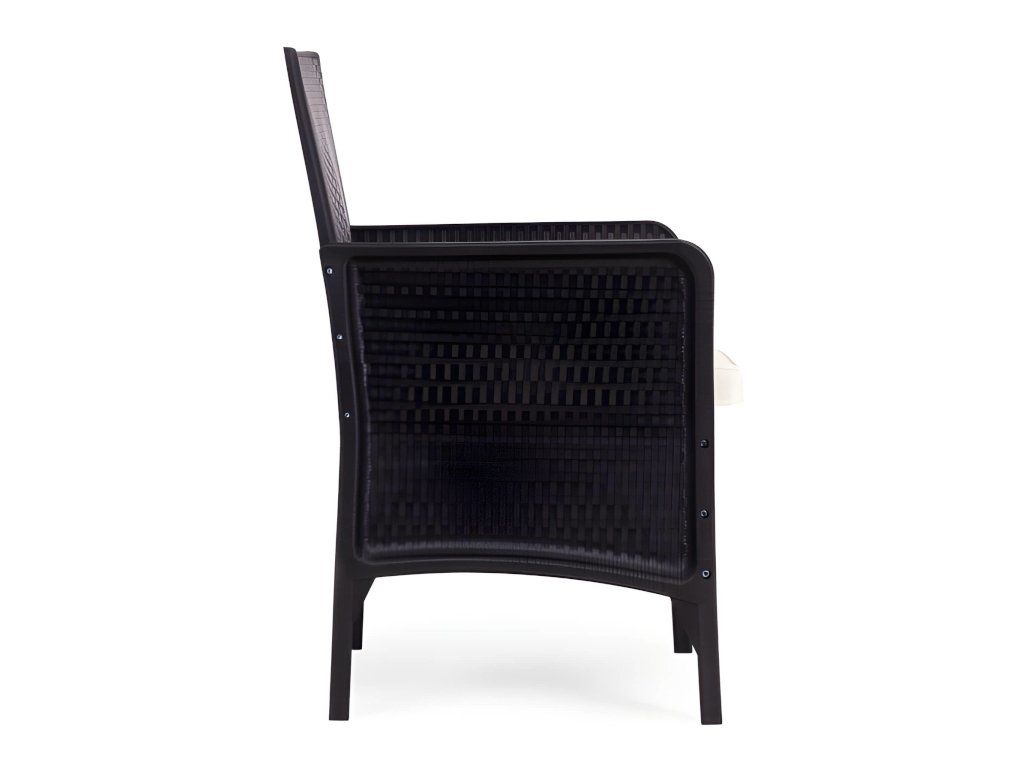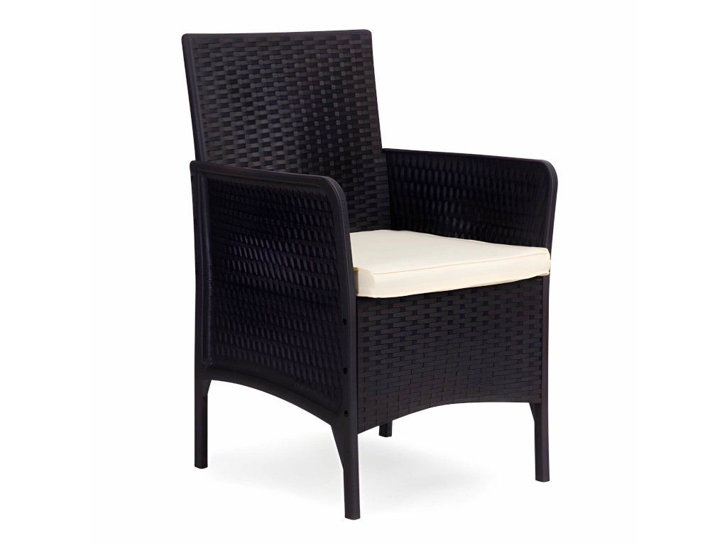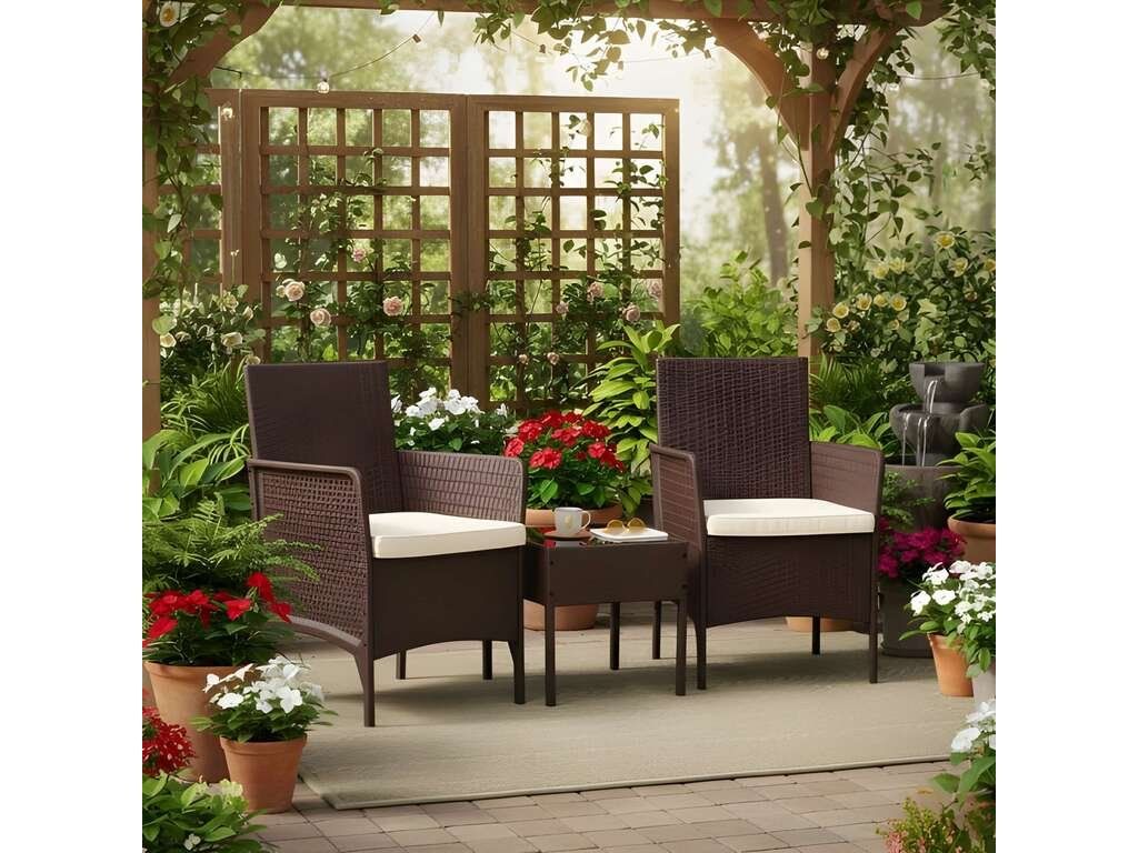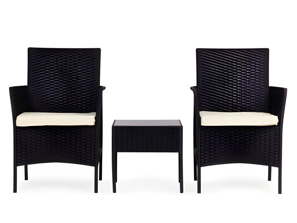 Ez a stílusos kerti bútor szett két fotelből és egy asztalból áll. A robusztus műanyag konstrukció, természetes rattant utánzó felülettel, időjárásállóságot, hosszú élettartamot és könnyű tisztítást biztosít. Az asztallap 5 mm vastag edzett üvegből készült, ami nagyfokú sérülésállóságot biztosít. A szett puha, vízálló poliészterből készült párnákat tartalmaz, amelyek súlya 160 g/m² (vastagság 4 cm). A szék maximális teherbírása 150 kg.