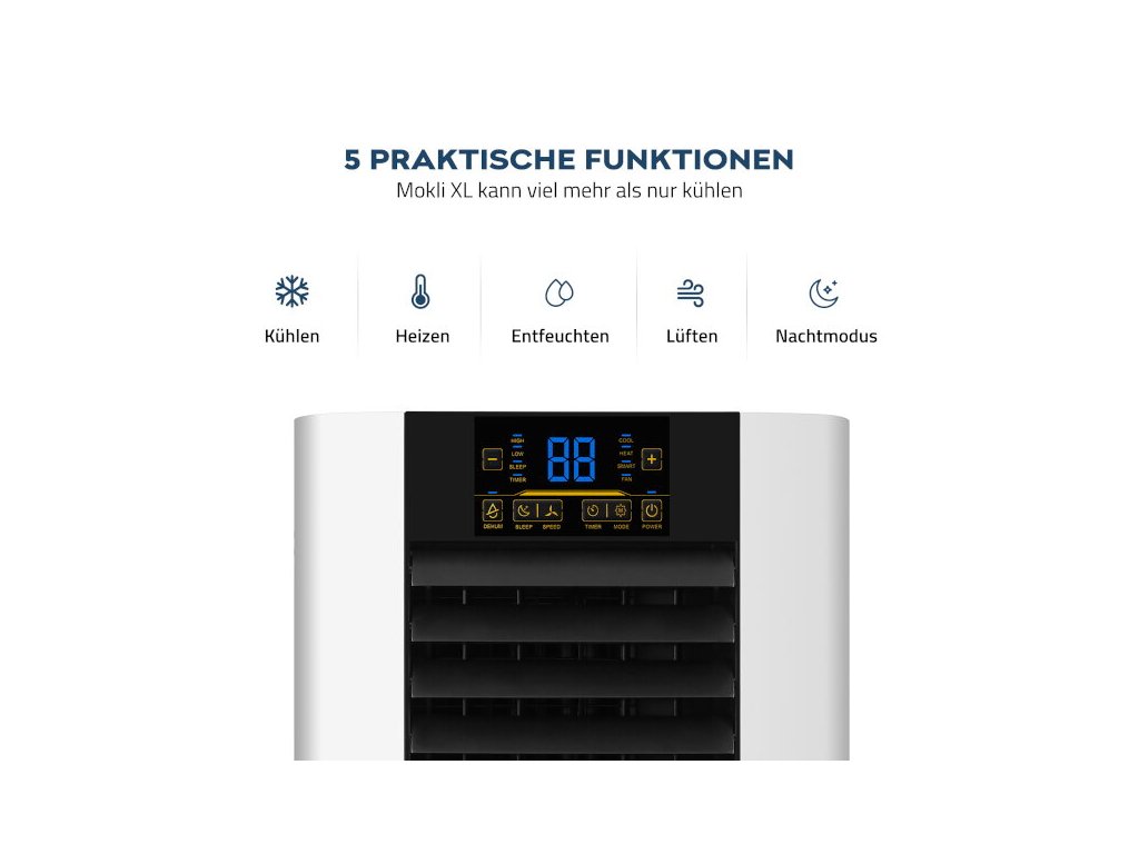 A forró nyarakon a kellemesen hűvös helyiségek tökéletes és pótolhatatlan menedékké válnak. Az új Mokli XL klíma segítségével könnyedén biztosíthatja a kívánt hőmérsékletet bármely helyiségben. Ezenkívül a készülék rendkívül hatékony és energiatakarékos.