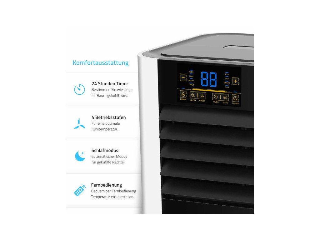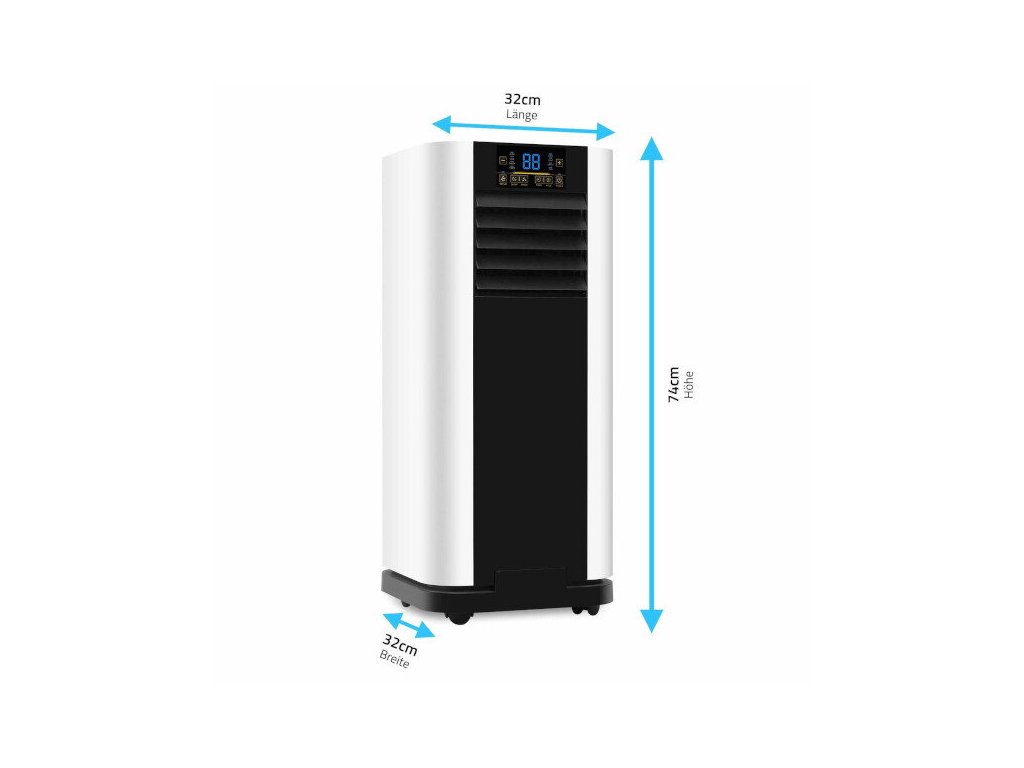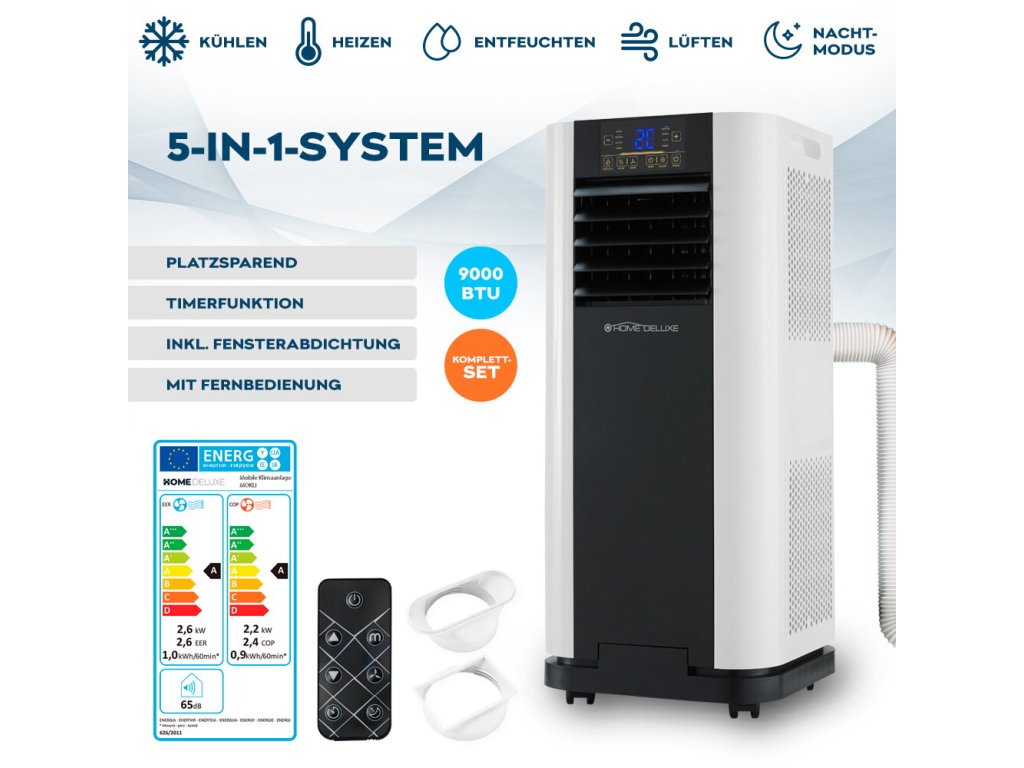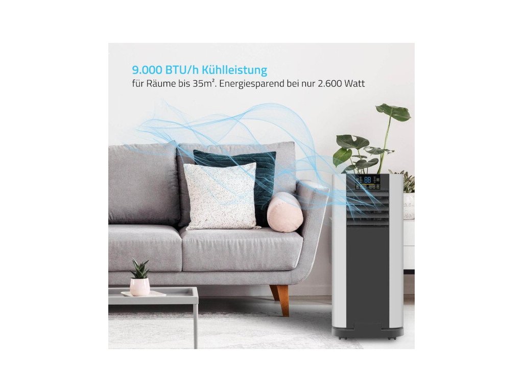 A mozgatható kerekeknek köszönhetően a készülék könnyen mozgatható, így mindig azonnal használatra kész ott, ahol a legnagyobb szükség van rá. A fúvott levegőtömlő rugalmas és alkalmazkodik a környezetéhez. A légkondicionáló párátlanító funkcióval és időzítővel van felszerelve, amely lehetővé teszi az intelligens hőmérsékletszabályozást például éjszaka is. Ezenkívül a levegő tisztítását integrált szűrők biztosítják. A készülék vezérlése magán a készüléken található kezelőpanelen keresztül, de praktikus távirányítóval is lehetséges. A csomag tartalmaz egy megfelelő ablaktömítést is, egyszerű tépőzáras rögzítéssel, bosszantó fúrás vagy csavarozás nélkül.