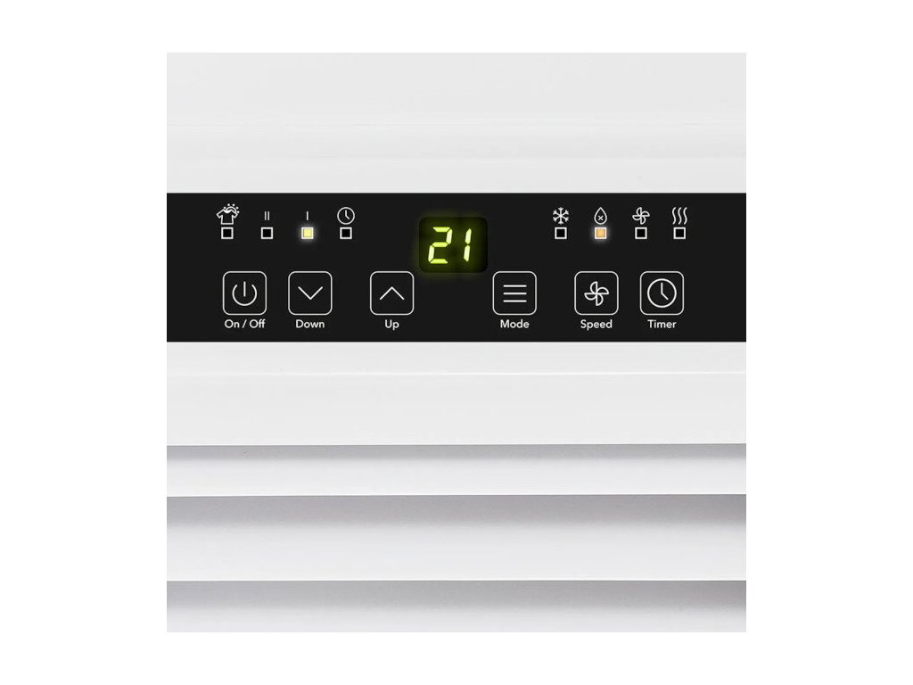 A membrángombokkal ellátott kezelőpanel egyszerű beállítást biztosít az üzemmód, az optimális helyiséghőmérséklet, valamint a megfelelő ventilátor-fordulatszám egyszerű beállításáról. A LED-kijelző a beállítástól függően mutatja a kívánt célhőmérsékletet vagy az automatikus ki- és bekapcsolásig tartó órák számát.