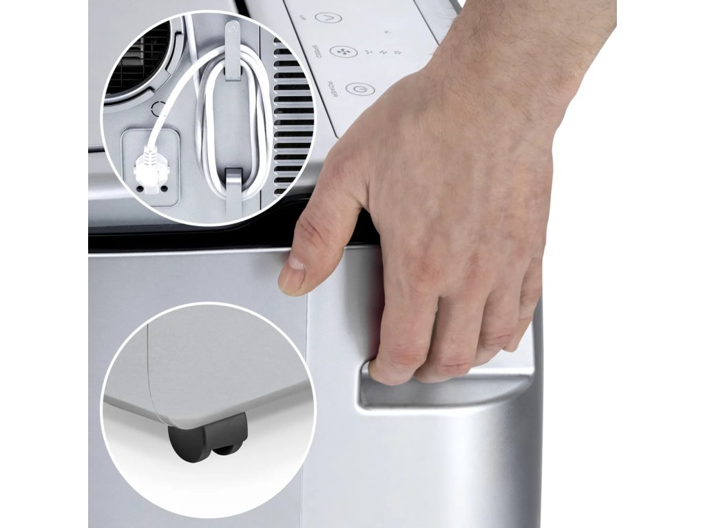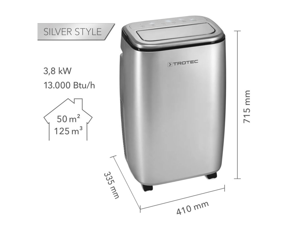 Akár otthon, üzlethelyiségben, hotelszobában vagy irodában – ezüst színű házával és 3,8 kW / 13 000 Btu/h hűtőteljesítményével az exkluzív PAC 3810 S klímaberendezés különösen alkalmas nagy, akár 50 m²-es vagy 125 m³-es helyiségekbe. A kényelem is lenyűgöző: távirányítóval, 24 órás időzítővel és éjszakai üzemmóddal a stílusos klímaberendezés maximális kényelmet kínál.