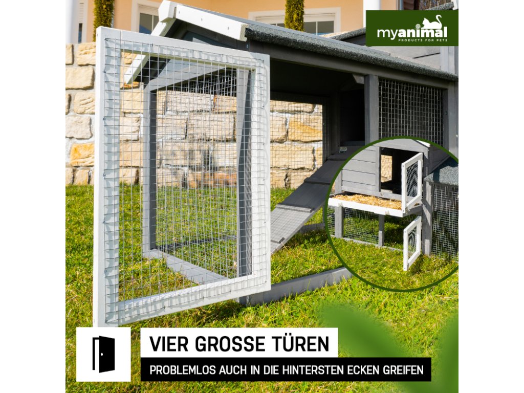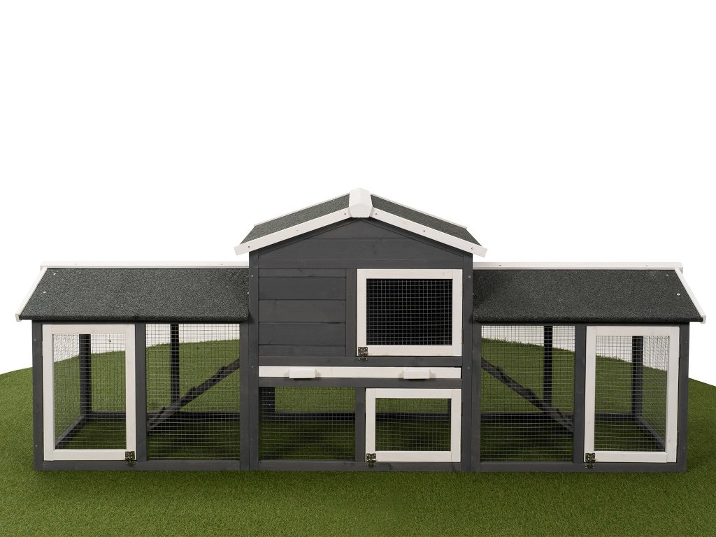 A nyúlketrecet időnként tisztítani kell. A három nagy ajtó sokat segít, mert ezeken keresztül még a legtávolabbi sarkokba is könnyen el lehet jutni. Ha például a nyulak elbújnak a vizsgálat elől, lehetősége van arra, hogy a nyúlketrecet két szinten nyissa ki. Így Ön is könnyedén eljuthat a nyulakhoz.