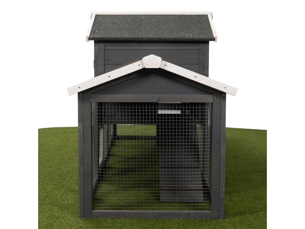 Az állatok szél és időjárás elleni védelme érdekében a nyúlketrec stabil tetővel van ellátva: Fenyőfából készült, aszfaltkartonnal borítva - ez egy rendkívül tartós kombináció. A tető azonban néhány egyszerű lépéssel leszerelhető, így a nyúlketrec belsejéhez korlátlanul hozzáférhet. A takarítási munkák ezért gond nélkül elvégezhetők.