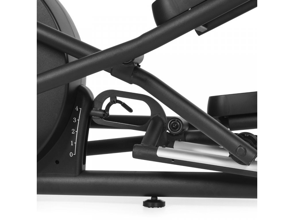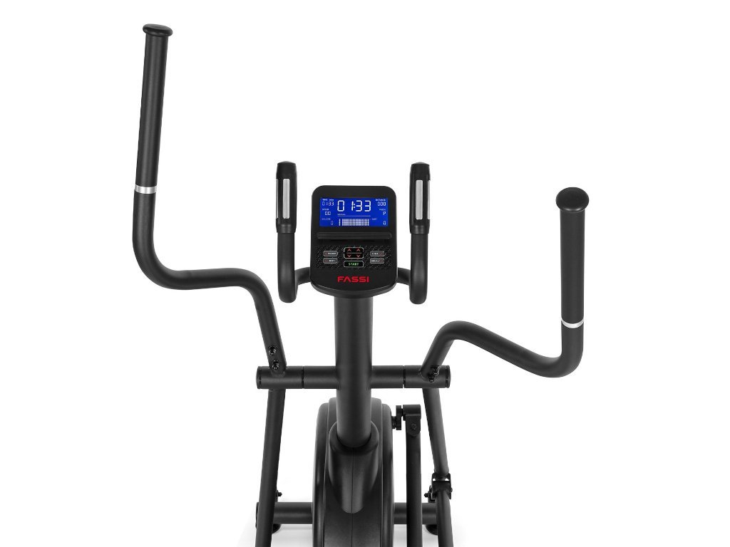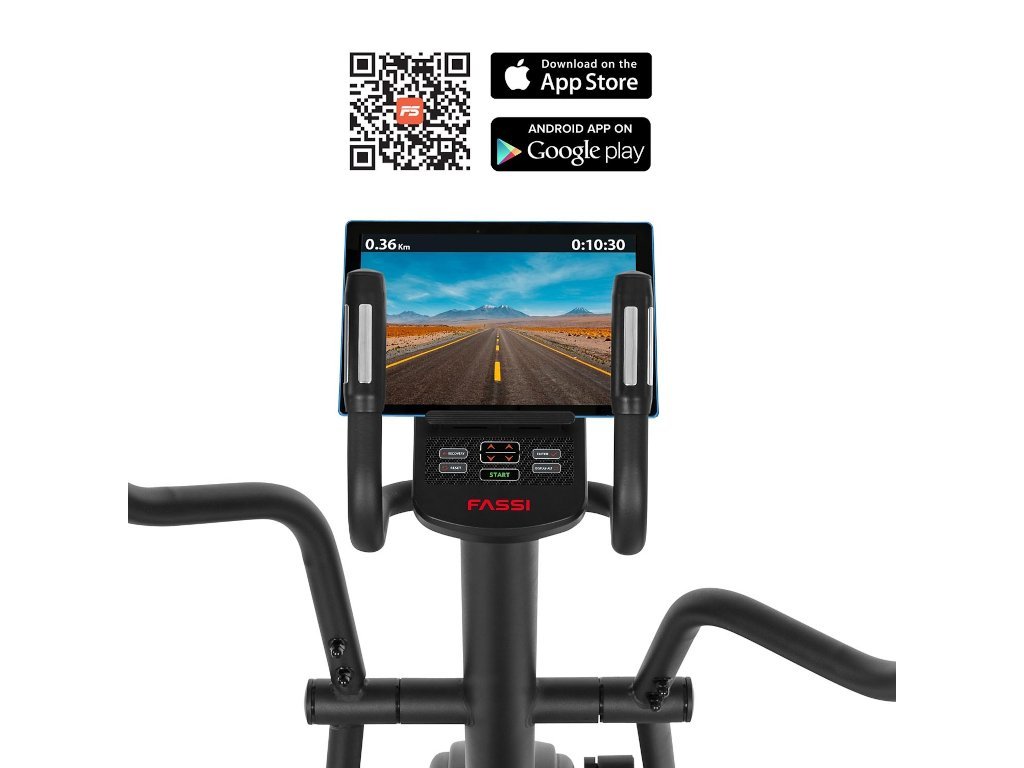 A Fassi FC 770 elliptikus tréner ideális eszköz a teljes testedzéshez. A mobiltelefonnal vagy táblagéppel ellátott Bluetooth csatlakozási rendszernek és 19 edzésprogramnak köszönhetően a Fitshow képzési alkalmazás lehetővé teszi, hogy mindig a legmagasabb szinten edzzen. A pulzusszám kézi pulzusérzékelőkkel ellenőrizhető. A 16 nehézségi fokozatnak és az állítható dőlésszögnek köszönhetően 5 különböző szinten állíthatja be az edzést az Ön számára legmegfelelőbbnek. A Fassi FC 770 tartóval is rendelkezik a tablet vagy más elektronikus eszköz kényelmes elhelyezéséhez.