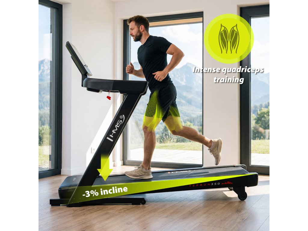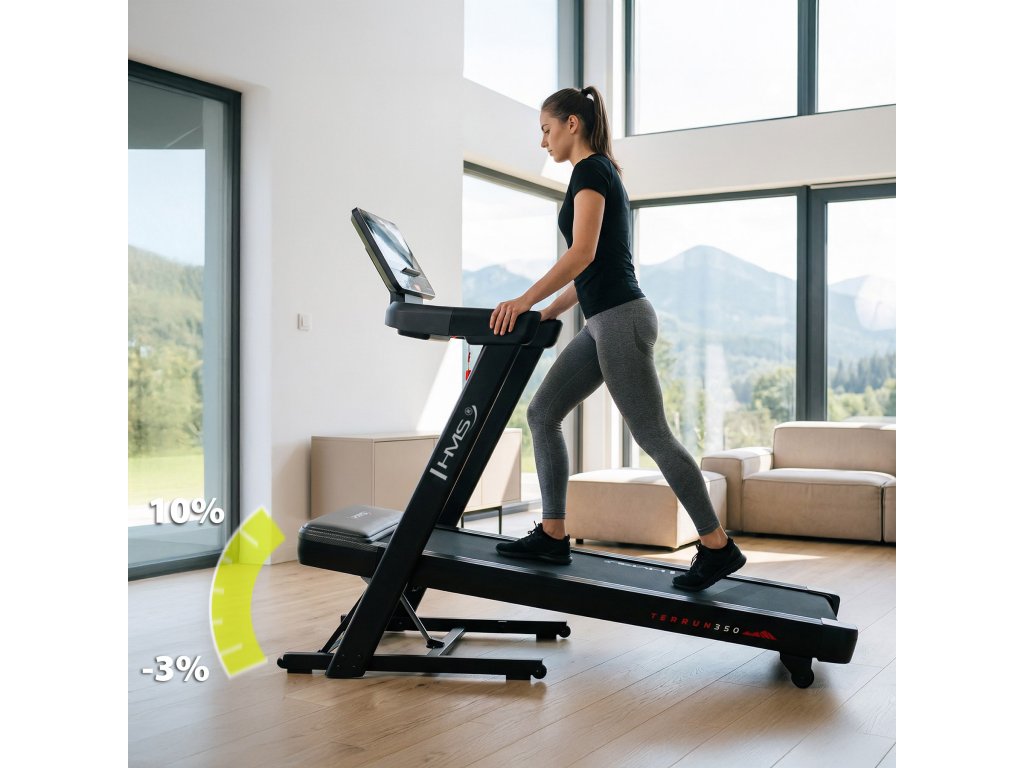 A TERRUN350 futópad -3% és 10% közötti dőlésszög-szabályozási tartományt kínál, amely lehetővé teszi mind a lejtmenet, mind a felfelé futás szimulálását: