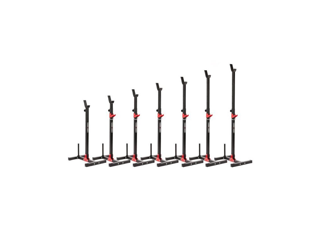 Az állványok 7 fokozatú magasságállítása (87 - 145 cm tartományban).A gumi végek az alapban és a súlyzó tartójában vannak.